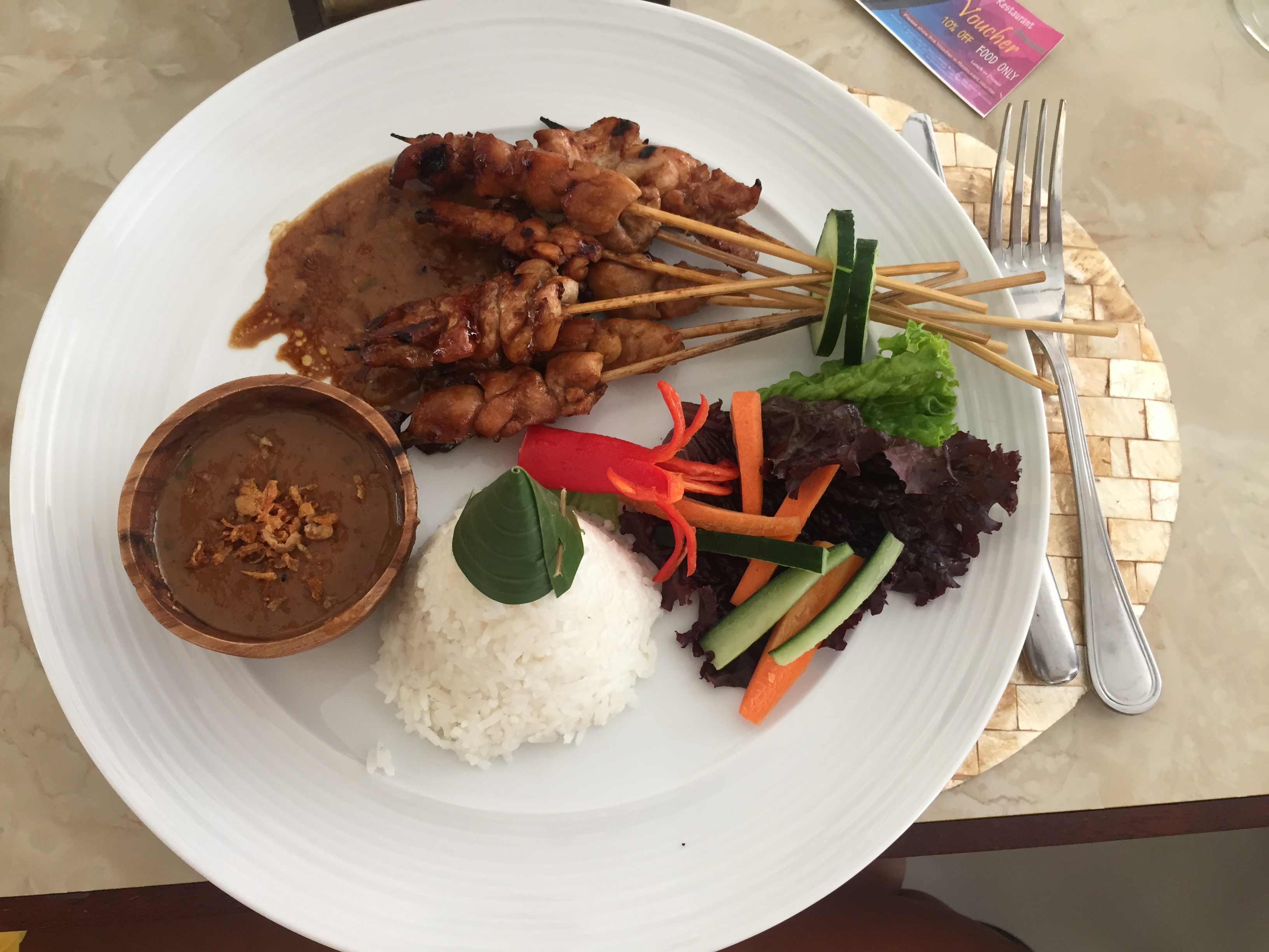Kým Američania sa po pozdrave bežne spýtajú „How are you?“ a Slováci „Ahoj, ako?“, v Indonézii je veľmi častá otázka „Sudah makan?“, v preklade: „Už si jedol?“ Tým vystihujú dôležitosť samotnej otázky. Indonézania sú najmä veľmi šikovní pestovatelia ryže. Na každom kroku sú ryžové polia, takže sa konzumuje ráno, na obed aj večer. Národné jedlo je nasi goreng, pražená ryža, ktorá sa bežne konzumuje s kúskami mäsa a so zeleninou alebo s volským okom. Saté je ďalšia lokálna pochúťka. Ide o kuracie mäso na špajdliach, podávané s ryžou, so zeleninou a s arašidovou omáčkou. Gado-gado je vynikajúca voľba pre vegetariánov. Obsahuje šalát zo zeleniny (šalát, paradajka, uhorka, klíčky, zelené fazuľky, zemiaky), podávaný s vareným vajíčkom, tofu a s tempe. Mie goreng je to isté ako nasi goreng, len namiesto smaženej ryže možno dostať smažené rezance. Existuje aj verzia „special“, ktorá ponúka vajíčko navyše.