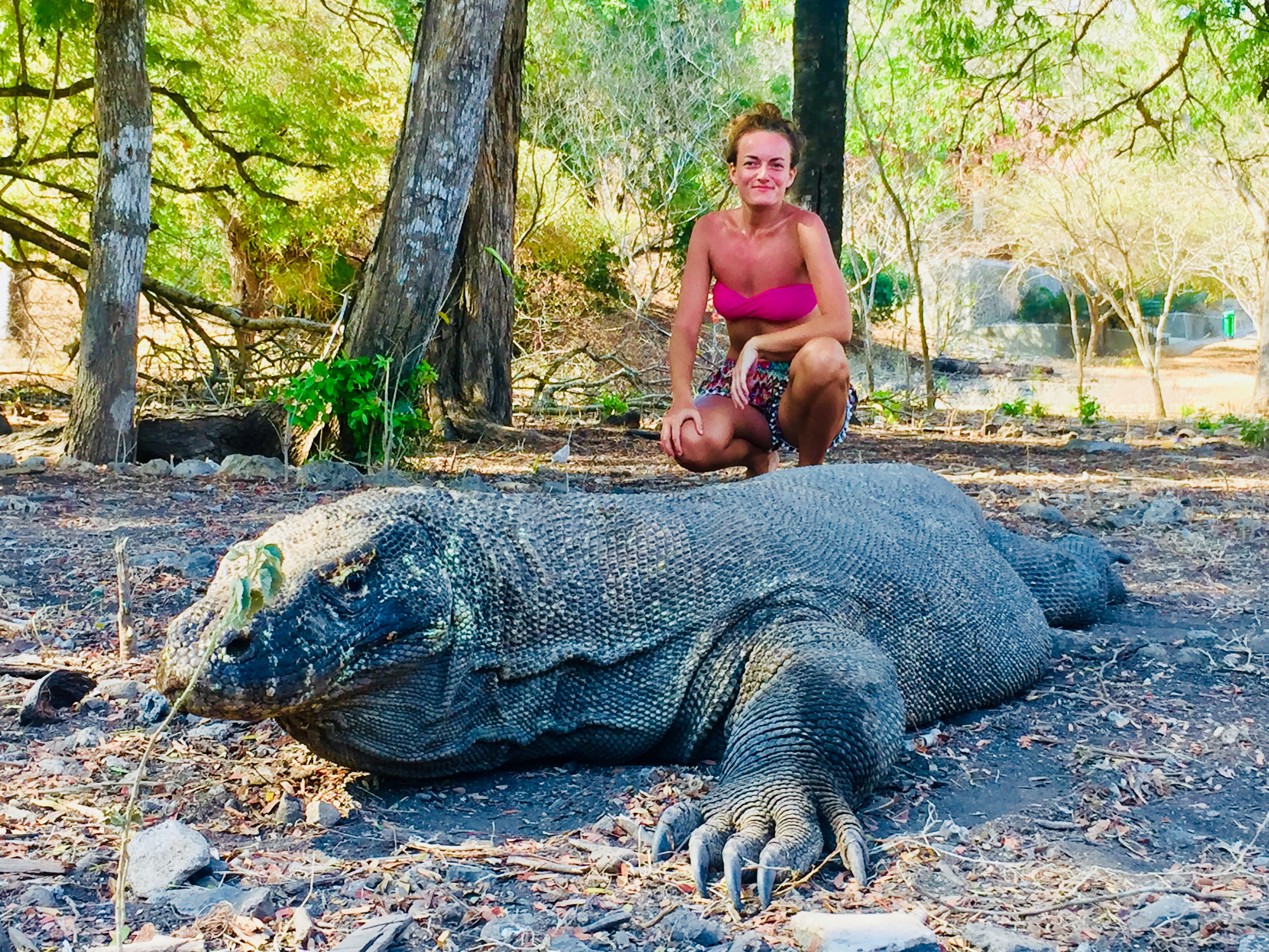 Hlavným programom výletu bol Národný park Komodo, kde je vstup povolený len s lokálnym sprievodcom. Išli s nami dvaja a porozprávali nám zaujímavé veci o endemických zvieratách varanoch komodských, nazývaných aj komodské draky. Vydávame sa na dvojhodinovú túru v nádeji, že tieto gigantické jaštery uvidíme voľne v prírode. Držíme sa tesne pri sprievodcoch, ktorí majú dlhú palicu zakončenú vidlicou. Zastavujeme pri hniezdach, kde sa varany liahnu. Kráčame hodnú chvíľu a stále nič, až to nakoniec prišlo. Blížime sa k nehybne ležiacemu jašterovi a k niekoľkým mláďatám. Nič nenamieta, keď sa s ním odfotíme. Je poriadne vypasený, má hrubé záhyby na šupinatej, dosiva sfarbenej koži. Povinný odstup od varana sú dva metre. Pozorne počúvame sprievodcov a zapisujeme si najdôležitejšie informácie.